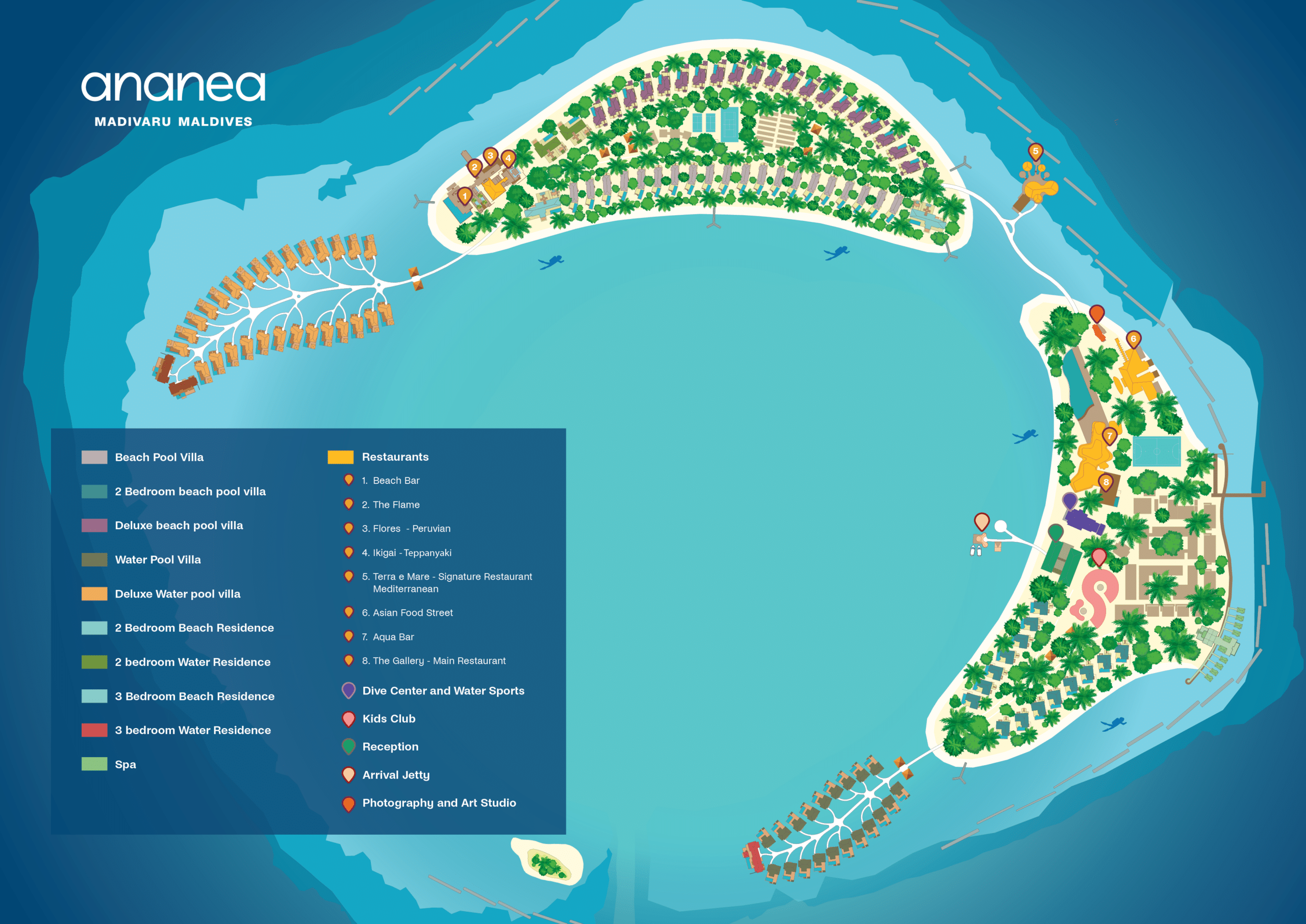 - Курорт із 110 віллами п’яти різних категорій пропонує вам максимальний комфорт, відпочинок і благополуччя. Вишуканий дизайн бренду ananea відповідає культурі та традиціям Мальдів.