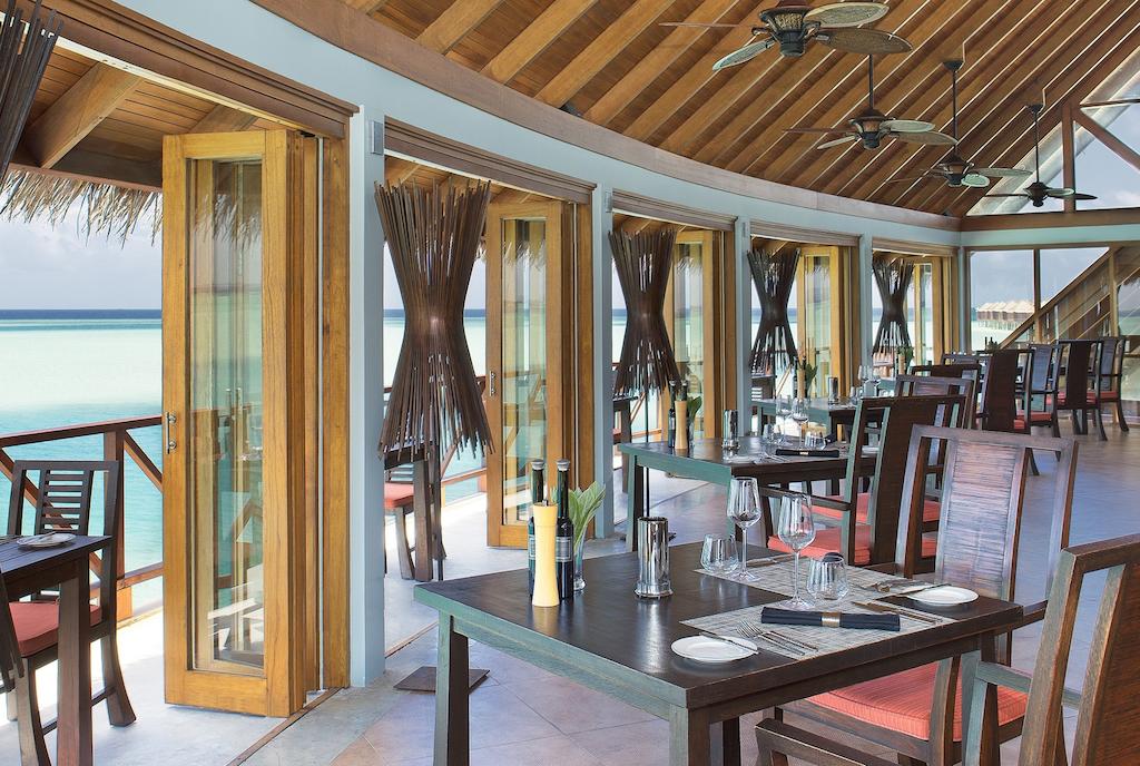 – ресторан Baan Huraa – расположенный на воде, в лагуне, ресторан предлагает своим гостям отведать блюда тайской кухни и насладиться видами на Индийский океан. Открыт на время обеда – с 12:00 до 14:30 и ужина – с 19:00 до 22:30;