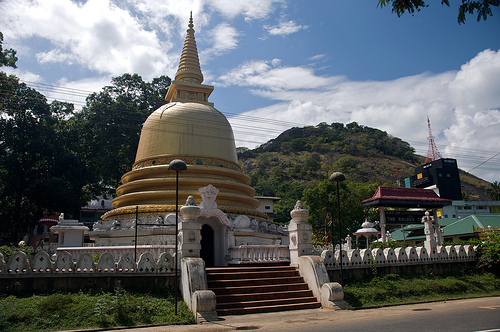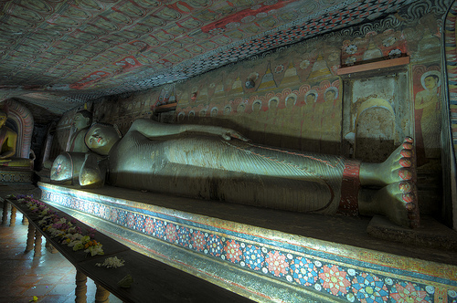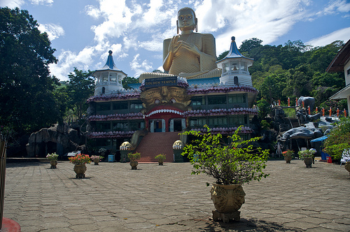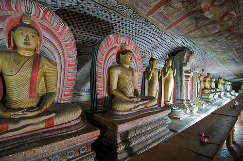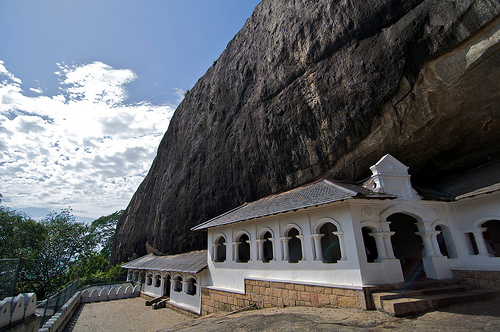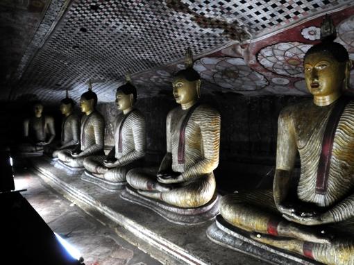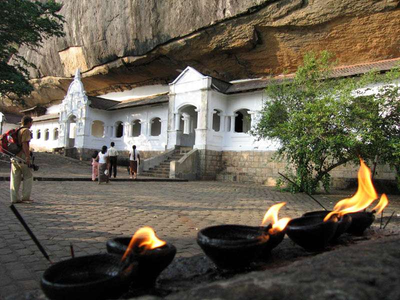 Дамбулла – Печерний храм Дамбулла було піднесено в дар, на знак подяки, Ордену буддійських ченців, які дали притулок королю Валагамбаху під час 14 річної окупації столиці Анурадхапури (89-103 рр. до н.е.). Про це свідчать брахмінські написи над входом у печери. Храм, побудований у 150 м. скелі, складається з 5 печер. Тут міститься найбільша колекція статуй Будди, багатьом з яких уже понад 2000 років. Залишки штукатурки зі слідами фарби зовні печер вказують на те, що храм являв собою суцільну галерею живопису. Храм датується 1 ст. до н.е., але добудовували і відновлювали в XII і XVIII століттях.