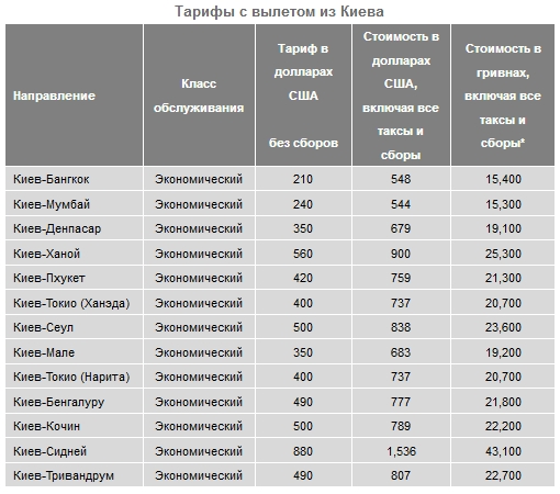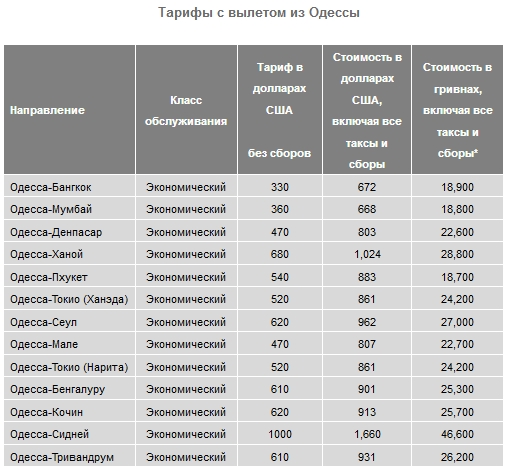*Тарифы на полет туда и обратно рассчитаны на 10 января 2019 и включают все налоги и сборы. Стоимость в гривнах округлена до сотен и может изменяться в зависимости от курсов валют. Действуют специальные ограничения и условия тарифов.