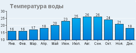 На всіх відритих ділянках моря температура води перевищує 22°C з червня по листопад, досягаючи 27°C у серпні. Навіть протягом трьох найпрохолодніших місяців із січня по березень середня температура моря не опускається нижче прийнятного рівня в 16-17°C. Близько узбережжя, температура води з глибиною моря три-чотири метри доволі близька до температури у відкритому морі, і коливається від 15°-17°C у лютому до 23-28°C у серпні. Температура води в морі протягом дня змінюється незначно, крім мілководдя з глибинами менше метра.