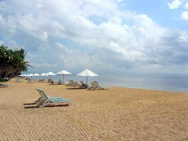 У Санурі широкі пляжі з дрібним піском. Пляжі захищені кораловими рифами і добре підходять для купання. Найкращий пісок на курорті – пляж готелю Grand Bali Beach. Відпочивальники з інших готелів можуть взяти напрокат лежаки та рушник.
