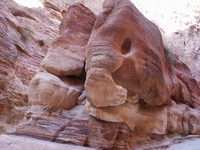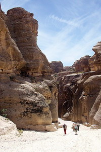 Решающим для того неизгладимого впечатления, которое Петра производит на всех приближающихся к ней путешественников, оказывается неожиданное и вместе с тем удивительно выгодное, можно сказать: эффектное расположение города, спрятанного в самом центре скалы, так что дорога к нему проходит по глубокому и узкому ущелью (местное название: сик), почти трещине в горе, возникшей здесь в результате доисторического землетрясения. Шаг за шагом продвигаясь между отвесных стен, возносящихся над Вами на 80-метровую высоту, с любопытством озираясь по сторонам и устремляя глаза вверх, вослед скальному разбегу, Вы невольно замечаете причудливое узорочье высеченных на стенах ущелья надписей на древних языках, перемежающихся с нишами или даже настоящими кельями, вырубленными в извилистых слоях известняка. С определённого момента Вам начинает казаться, что это блуждание по лабиринту будет бесконечным, – и в тот же миг ущелье внезапно обрывается и перед Вами распахивается величественная перспектива Петры. Древний город, за тысячелетия одиночества словно тоже истосковавшийся по человеку, теперь как будто сам вырывается из скал Вам навстречу. При этом Петра, словно уже совсем было родившаяся и выпроставшаяся из каменных простыней, продолжает оставаться в самом сердце, точнее, под сердцем горы, будто бы неожиданно раздумав покидать родное чрево.